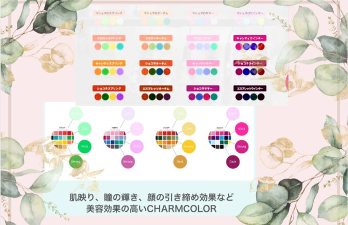 4つのシーズンを12タイプに分けたもので、2025.10.18からは16タイプに分類されたチャームカラー診断になります。どちらも、美容効果を目的とした診断結果のお伝えです。チャームカラーは専用ドレープで診断する事ができます。